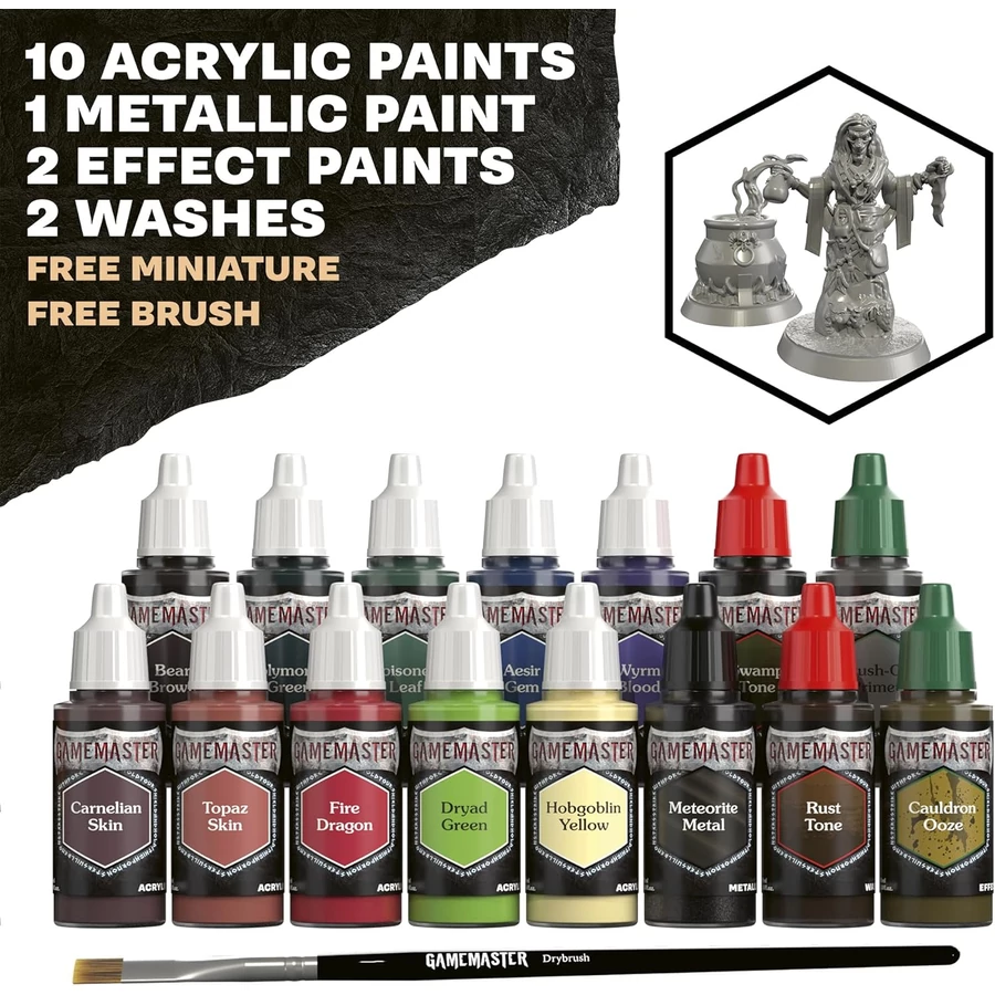 The GameMaster: Wilderness Adventures Role-Playing Paint Set includes 15 paints, consisting of 10 vibrant colours, 2 Effect paints, 1 Metallic paint, and 2 versatile Washes – all specially selected to go with the Wilderness theme. You also get a Painting Guide, a GameMaster: Drybrush, and a snap-fit cauldron and hag miniature – FREE!