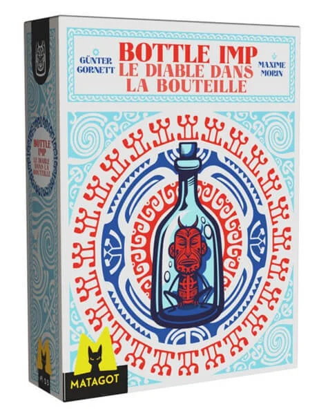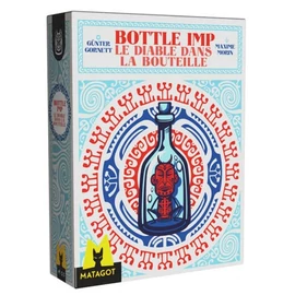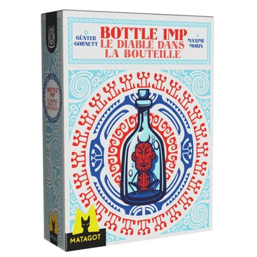 In this trick-taking game based on the short story by Robert Louis Stevenson of the same name, the goal is to gain the most points over a series of hands (usually the goal is set to 200 pts). Cards are numbered 1-37 and are found in three colors, red (comprising largely the highest numbers), blue (mostly in the middle) and yellow (mostly the lowest numbers) with colors being analogous to the suit in a standard deck. There is one neutral card, the 19, that sets the „price of the bottle.”