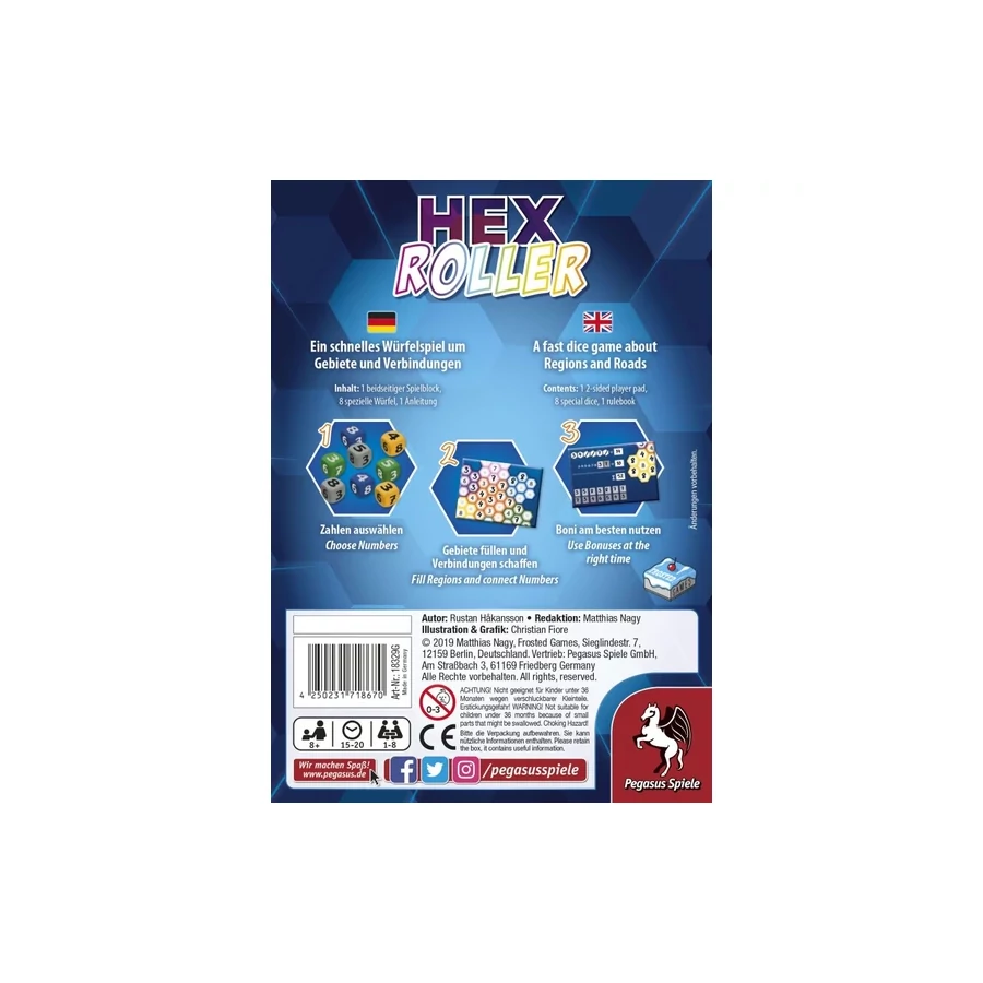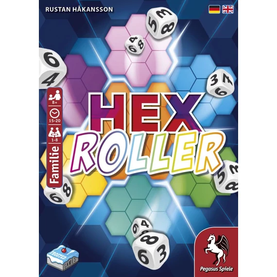 A HexRoller egy roll-and-write játék, amelyben a játékosok minden körben két dobókockát húznak, majd egy hatszögletű rácson található mezőket töltenek fel, és megpróbálják lezárni a régiókat, illetve azonos számokból álló sorokat létrehozni, hogy maximalizálják a pontszámukat. Ki tudja a megfelelő időben felhasználni a bónuszokat, hogy az élre törjön?